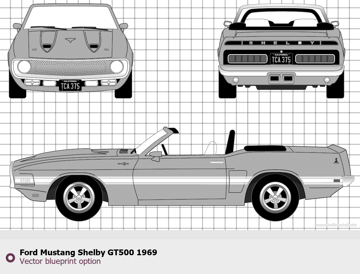 Raster blueprint of the 1969 Ford Mustang Shelby GT500 Tag. This free downloadable image can be used for graphic projects, digital design, and 3D modeling. The file provides accurate exterior proportions of the vehicle. Model year: 1969. Body type: Tag.