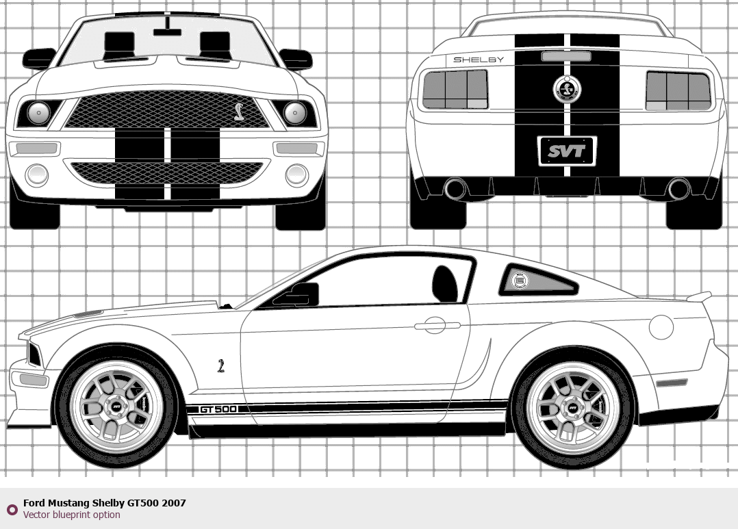 Raster blueprint of the 2007 Ford Mustang Shelby GT500 Tag. This free downloadable image can be used for graphic projects, digital design, and 3D modeling. The file provides accurate exterior proportions of the vehicle. Model year: 2007. Body type: Tag.