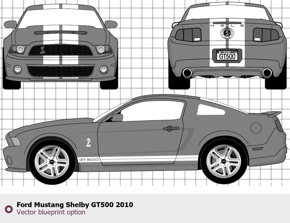 Raster blueprint of the 2010 Ford Mustang Shelby GT500 Tag. This free downloadable image can be used for graphic projects, digital design, and 3D modeling. The file provides accurate exterior proportions of the vehicle. Model year: 2010. Body type: Tag.