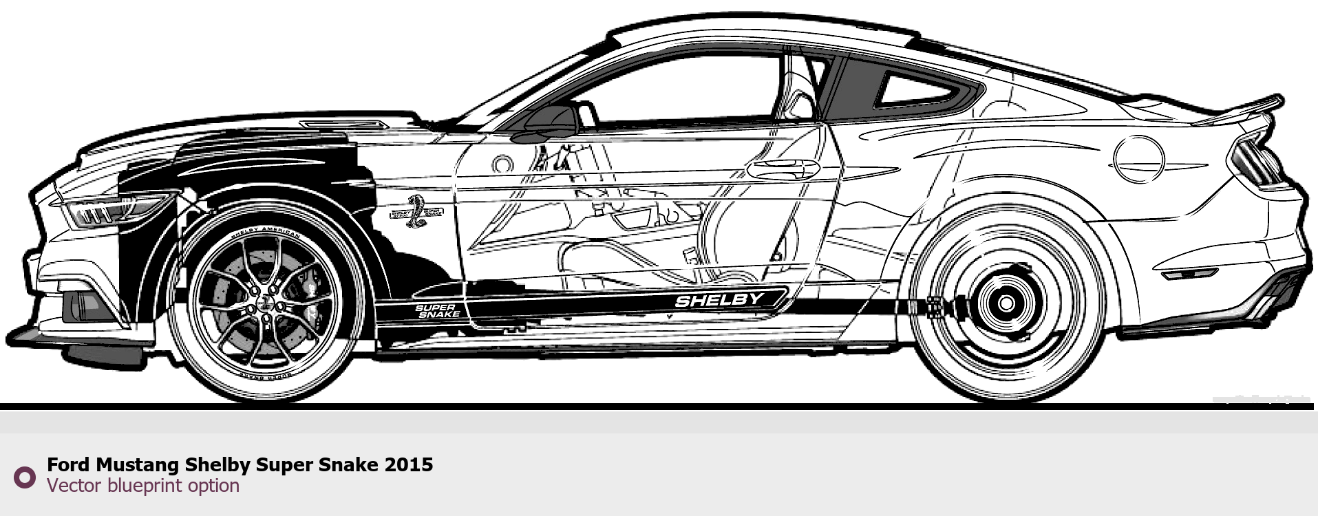 Raster blueprint of the 2015 Ford Mustang Shelby Super Snake Tag. This free downloadable image can be used for graphic projects, digital design, and 3D modeling. The file provides accurate exterior proportions of the vehicle. Model year: 2015. Body type: Tag.