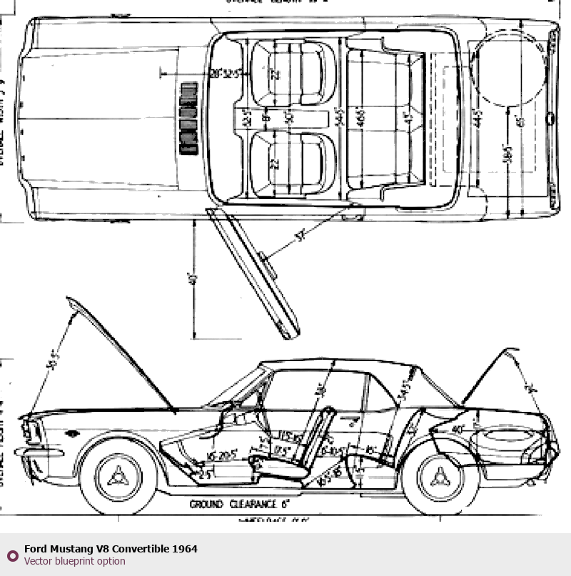Raster blueprint of the 1964 Ford Mustang V8 Convertible Cabriolet. This free downloadable image can be used for graphic projects, digital design, and 3D modeling. The file provides accurate exterior proportions of the vehicle. Model year: 1964. Body type: Cabriolet.
