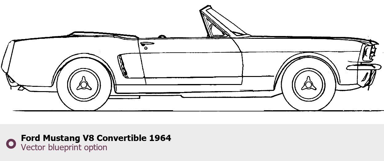 Raster blueprint of the 1964 Ford Mustang V8 Convertible Cabriolet. This free downloadable image can be used for graphic projects, digital design, and 3D modeling. The file provides accurate exterior proportions of the vehicle. Model year: 1964. Body type: Cabriolet.