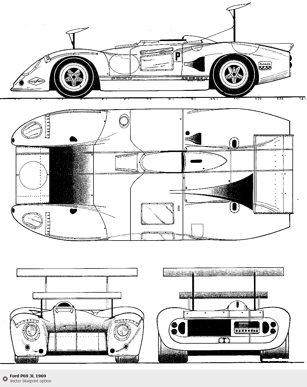 Raster blueprint of the 1969 Ford P69 3L Tag. This free downloadable image can be used for graphic projects, digital design, and 3D modeling. The file provides accurate exterior proportions of the vehicle. Model year: 1969. Body type: Tag.