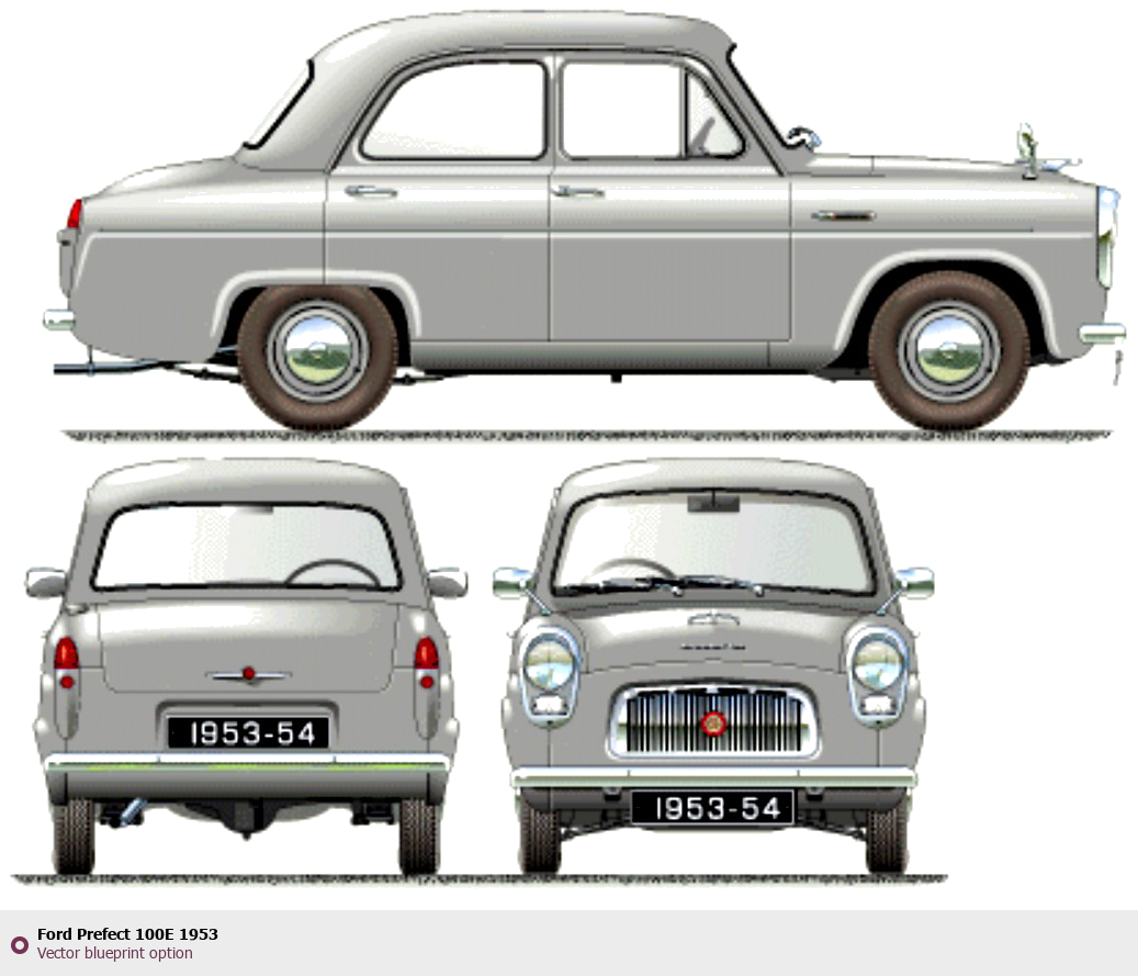 Raster blueprint of the 1953 Ford Prefect 100E Sedan. This free downloadable image can be used for graphic projects, digital design, and 3D modeling. The file provides accurate exterior proportions of the vehicle. Model year: 1953. Body type: Sedan.