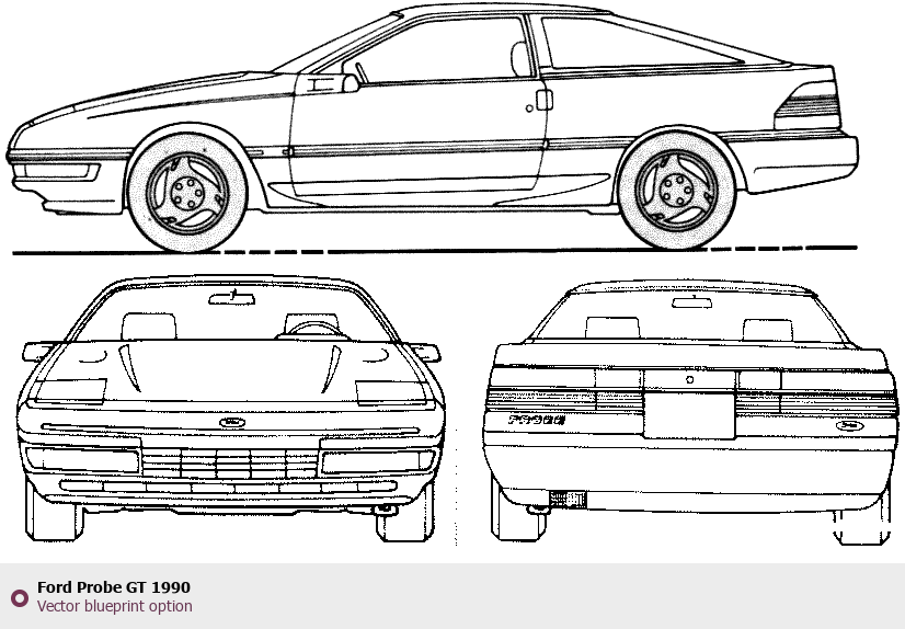 Raster blueprint of the 1990 Ford Probe GT Coupe. This free downloadable image can be used for graphic projects, digital design, and 3D modeling. The file provides accurate exterior proportions of the vehicle. Model year: 1990. Body type: Coupe.