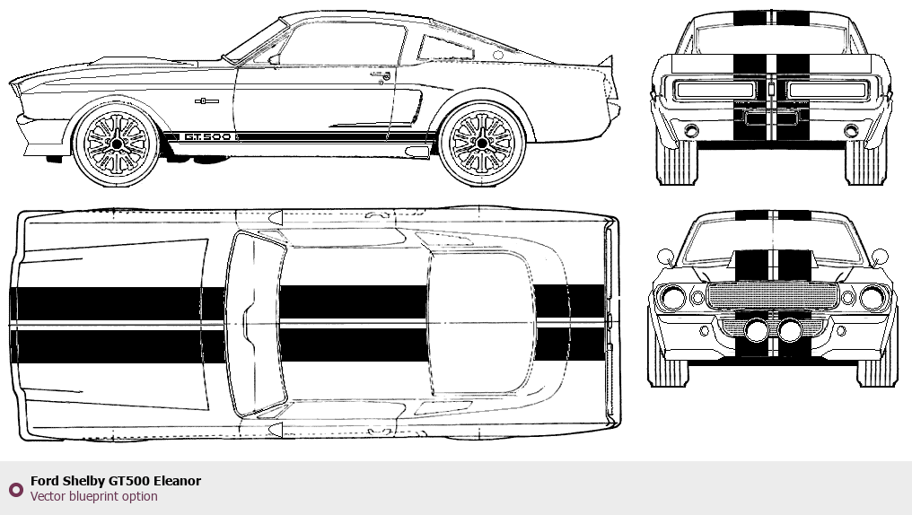 Raster blueprint of the Ford Shelby GT500 Eleanor Coupe. This free downloadable image can be used for graphic projects, digital design, and 3D modeling. The file provides accurate exterior proportions of the vehicle. Body type: Coupe.