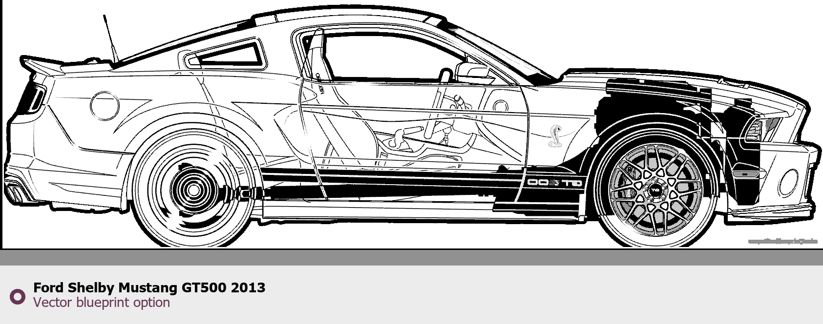Raster blueprint of the 2013 Ford Shelby Mustang GT500 Coupe. This free downloadable image can be used for graphic projects, digital design, and 3D modeling. The file provides accurate exterior proportions of the vehicle. Model year: 2013. Body type: Coupe.