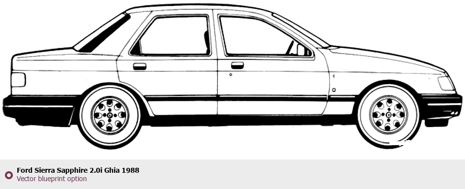 Raster blueprint of the 1988 Ford Sierra Sapphire 2.0i Ghia Tag. This free downloadable image can be used for graphic projects, digital design, and 3D modeling. The file provides accurate exterior proportions of the vehicle. Model year: 1988. Body type: Tag.