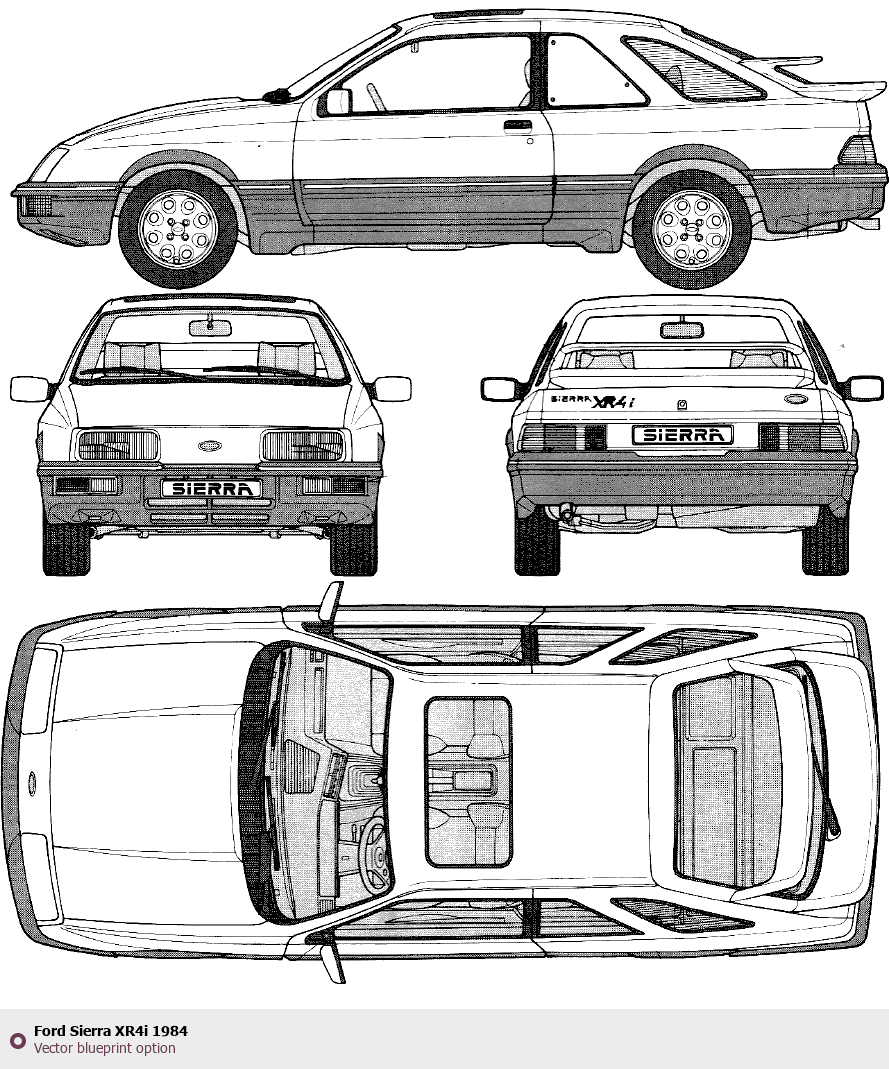 Raster blueprint of the 1984 Ford Sierra XR4i Tag. This free downloadable image can be used for graphic projects, digital design, and 3D modeling. The file provides accurate exterior proportions of the vehicle. Model year: 1984. Body type: Tag.