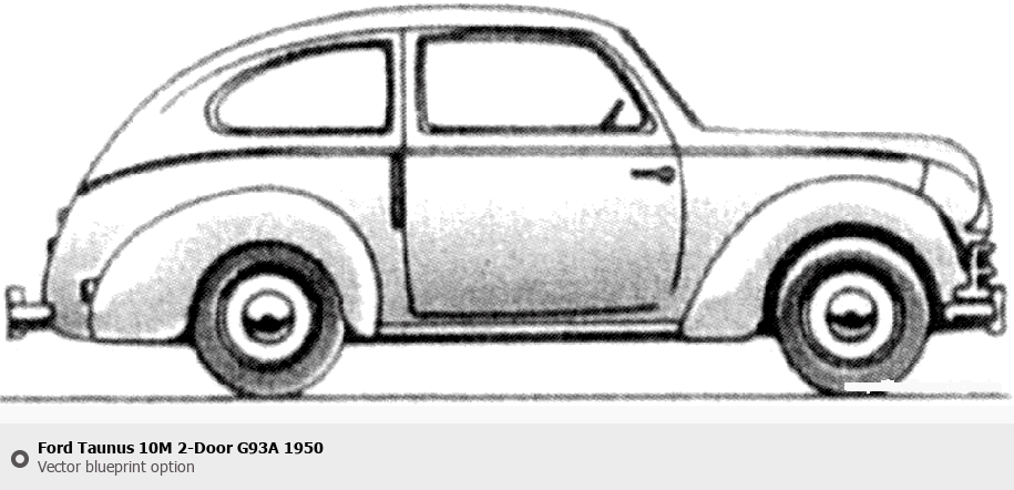 Raster blueprint of the 1950 Ford Taunus 10M 2-Door G93A Tag. This free downloadable image can be used for graphic projects, digital design, and 3D modeling. The file provides accurate exterior proportions of the vehicle. Model year: 1950. Body type: Tag.