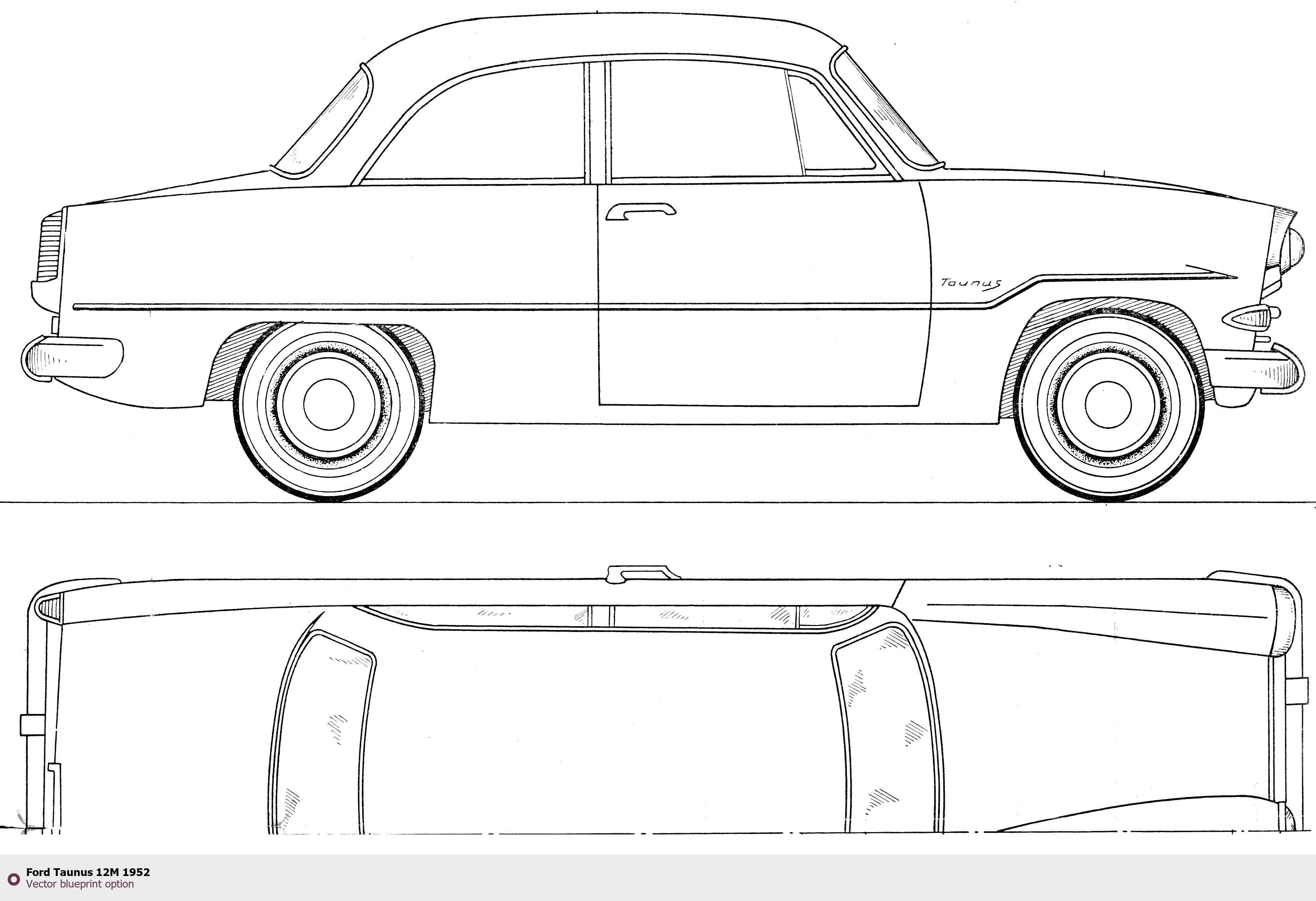 Raster blueprint of the 1952 Ford Taunus 12M Tag. This free downloadable image can be used for graphic projects, digital design, and 3D modeling. The file provides accurate exterior proportions of the vehicle. Model year: 1952. Body type: Tag.