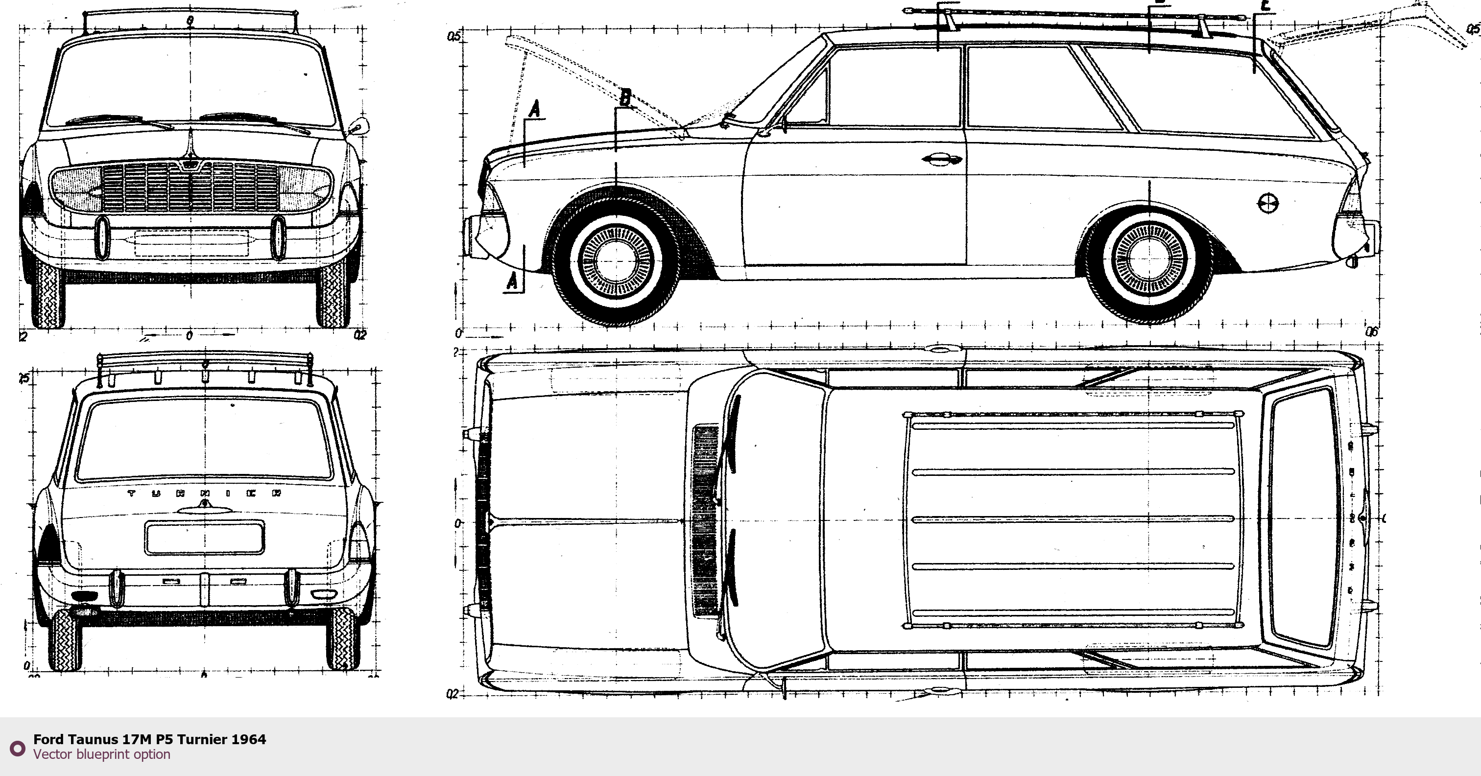 Raster blueprint of the 1964 Ford Taunus 17M P5 Turnier Tag. This free downloadable image can be used for graphic projects, digital design, and 3D modeling. The file provides accurate exterior proportions of the vehicle. Model year: 1964. Body type: Tag.