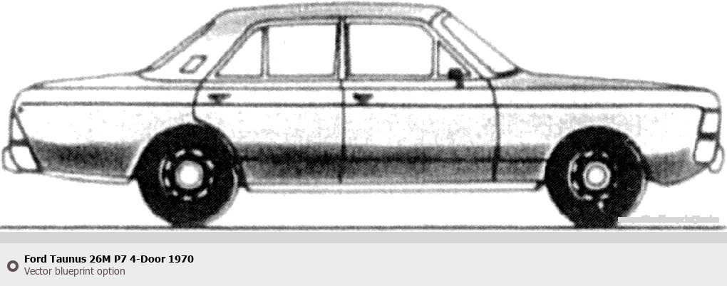 Raster blueprint of the 1970 Ford Taunus 26M P7 4-Door Tag. This free downloadable image can be used for graphic projects, digital design, and 3D modeling. The file provides accurate exterior proportions of the vehicle. Model year: 1970. Body type: Tag.