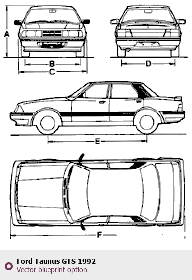 Raster blueprint of the 1992 Ford Taunus GTS Tag. This free downloadable image can be used for graphic projects, digital design, and 3D modeling. The file provides accurate exterior proportions of the vehicle. Model year: 1992. Body type: Tag.