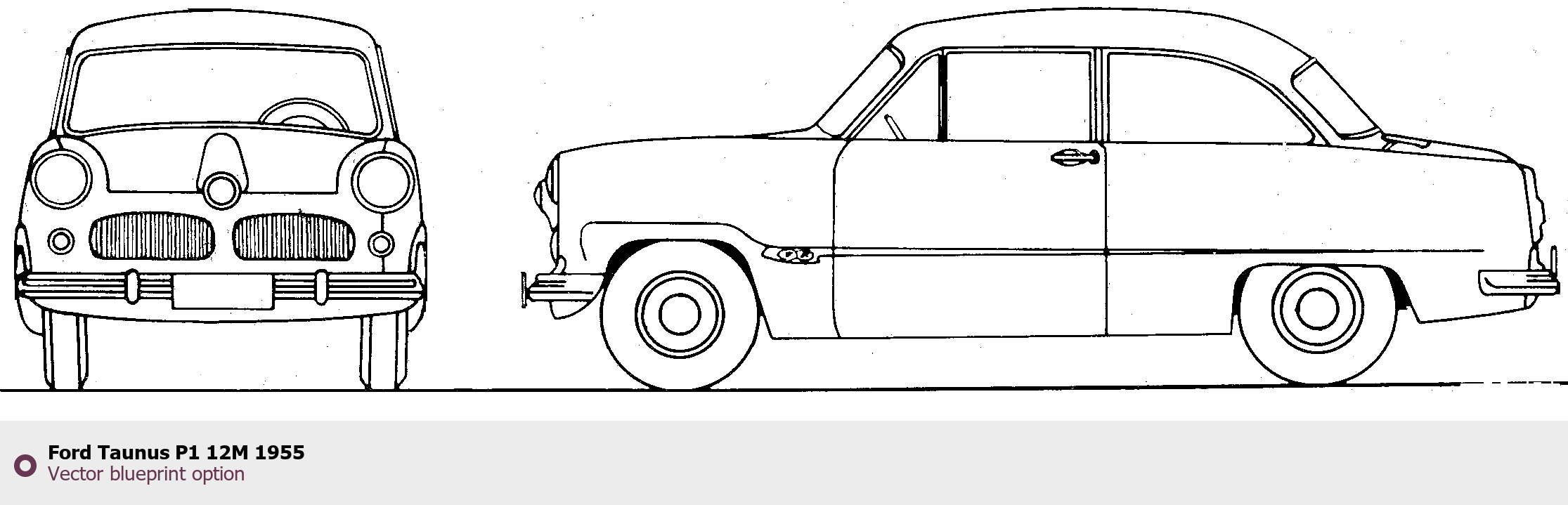 Raster blueprint of the 1955 Ford Taunus P1 12M Tag. This free downloadable image can be used for graphic projects, digital design, and 3D modeling. The file provides accurate exterior proportions of the vehicle. Model year: 1955. Body type: Tag.