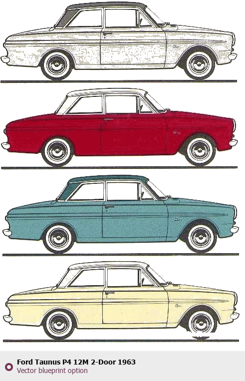 Raster blueprint of the 1963 Ford Taunus P4 12M 2-Door Tag. This free downloadable image can be used for graphic projects, digital design, and 3D modeling. The file provides accurate exterior proportions of the vehicle. Model year: 1963. Body type: Tag.