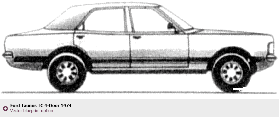 Raster blueprint of the 1974 Ford Taunus TC 4-Door Tag. This free downloadable image can be used for graphic projects, digital design, and 3D modeling. The file provides accurate exterior proportions of the vehicle. Model year: 1974. Body type: Tag.