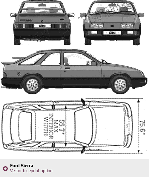 Raster blueprint of the Ford Sierra Tag. This free downloadable image can be used for graphic projects, digital design, and 3D modeling. The file provides accurate exterior proportions of the vehicle. Body type: Tag.