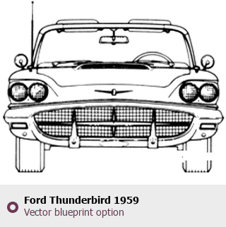 Raster blueprint of the 1959 Ford Thunderbird Tag. This free downloadable image can be used for graphic projects, digital design, and 3D modeling. The file provides accurate exterior proportions of the vehicle. Model year: 1959. Body type: Tag.