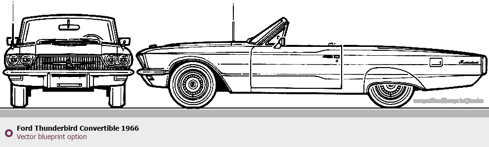 Raster blueprint of the 1966 Ford Thunderbird Convertible Cabriolet. This free downloadable image can be used for graphic projects, digital design, and 3D modeling. The file provides accurate exterior proportions of the vehicle. Model year: 1966. Body type: Cabriolet.
