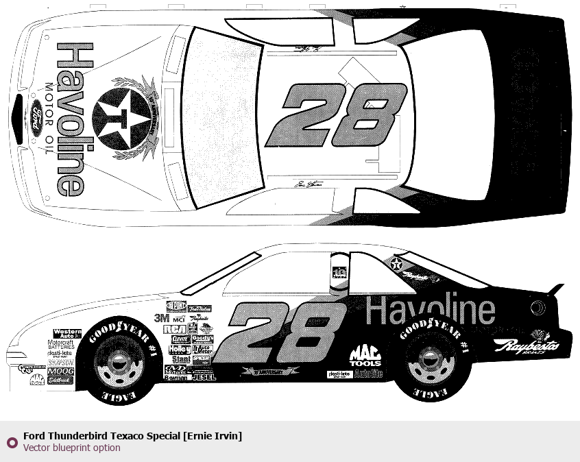 Raster blueprint of the Ford Thunderbird Texaco Special [Ernie Irvin] Tag. This free downloadable image can be used for graphic projects, digital design, and 3D modeling. The file provides accurate exterior proportions of the vehicle. Body type: Tag.