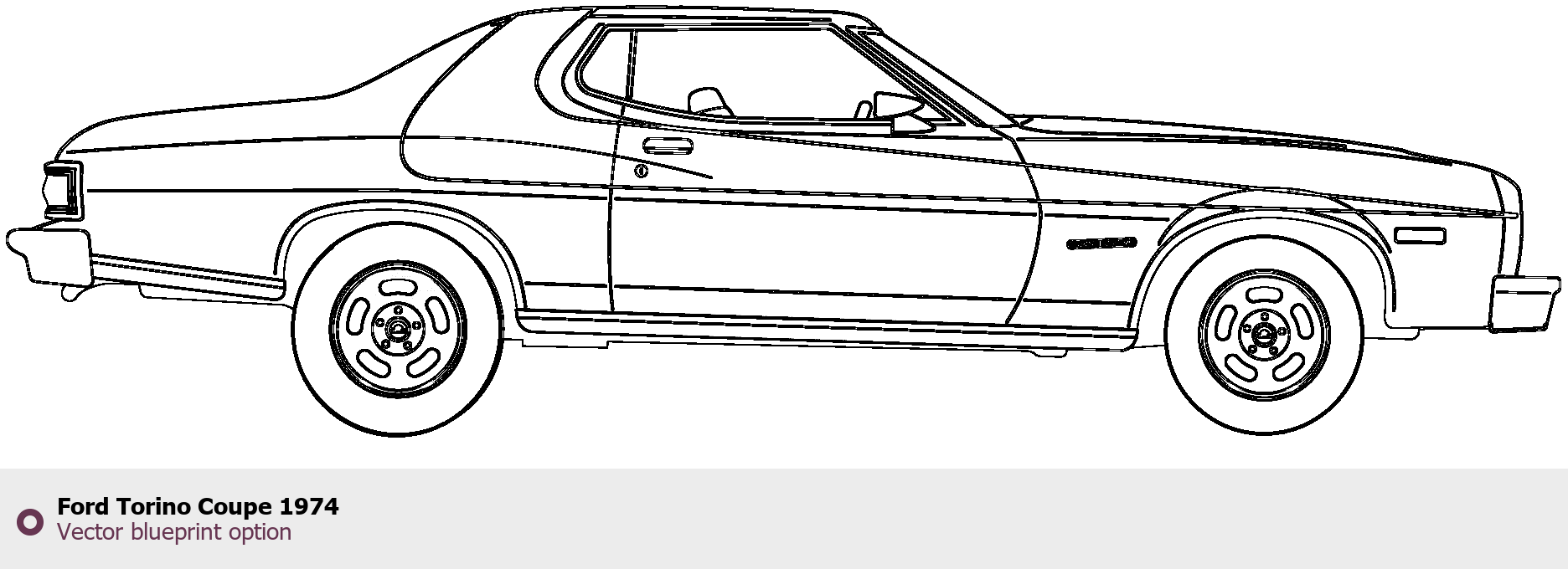 Raster blueprint of the 1974 Ford Torino Coupe Coupe. This free downloadable image can be used for graphic projects, digital design, and 3D modeling. The file provides accurate exterior proportions of the vehicle. Model year: 1974. Body type: Coupe.