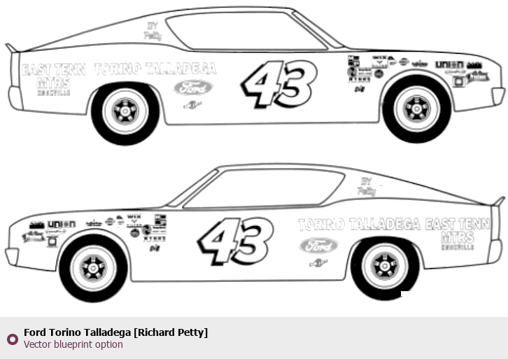 Raster blueprint of the Ford Torino Talladega [Richard Petty] Tag. This free downloadable image can be used for graphic projects, digital design, and 3D modeling. The file provides accurate exterior proportions of the vehicle. Body type: Tag.