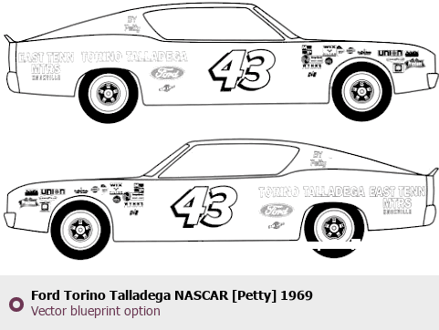 Raster blueprint of the 1969 Ford Torino Talladega NASCAR [Petty] Tag. This free downloadable image can be used for graphic projects, digital design, and 3D modeling. The file provides accurate exterior proportions of the vehicle. Model year: 1969. Body type: Tag.