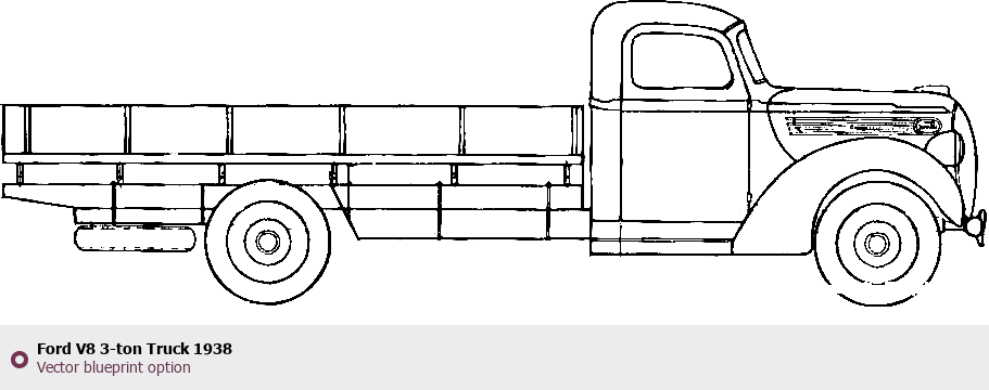 Raster blueprint of the 1938 Ford V8 3-ton Truck Coupe. This free downloadable image can be used for graphic projects, digital design, and 3D modeling. The file provides accurate exterior proportions of the vehicle. Model year: 1938. Body type: Coupe.