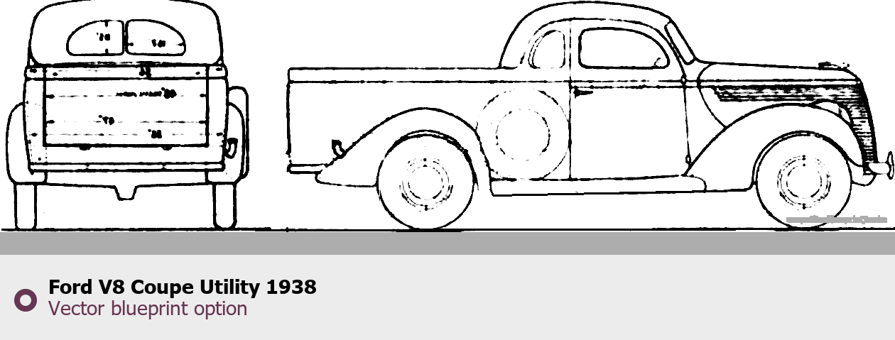 Raster blueprint of the 1938 Ford V8 Coupe Utility Coupe. This free downloadable image can be used for graphic projects, digital design, and 3D modeling. The file provides accurate exterior proportions of the vehicle. Model year: 1938. Body type: Coupe.
