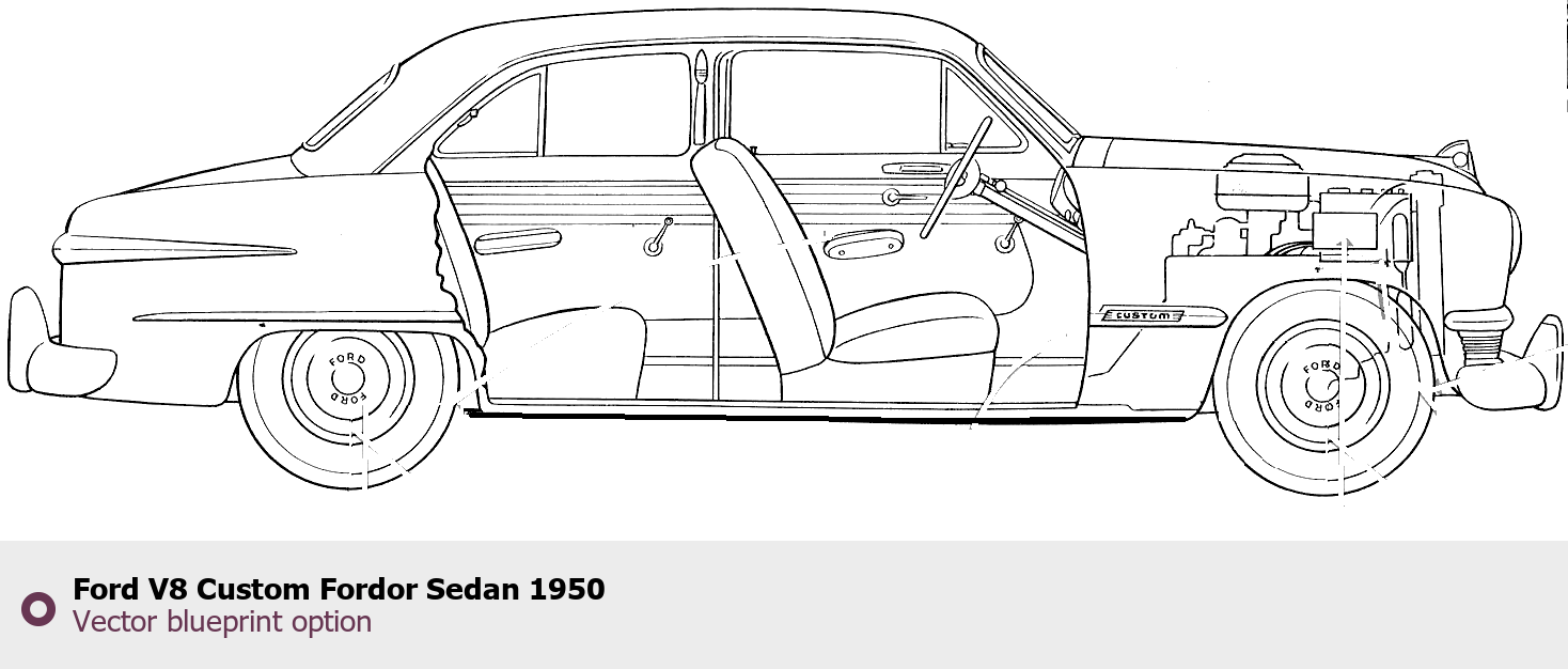 Raster blueprint of the 1950 Ford V8 Custom Fordor Sedan Coupe. This free downloadable image can be used for graphic projects, digital design, and 3D modeling. The file provides accurate exterior proportions of the vehicle. Model year: 1950. Body type: Coupe.