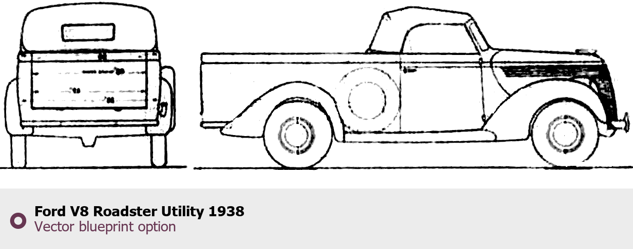 Raster blueprint of the 1938 Ford V8 Roadster Utility Coupe. This free downloadable image can be used for graphic projects, digital design, and 3D modeling. The file provides accurate exterior proportions of the vehicle. Model year: 1938. Body type: Coupe.
