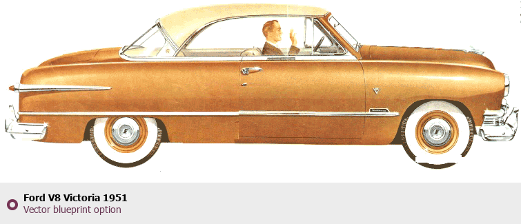 Raster blueprint of the 1951 Ford V8 Victoria Coupe. This free downloadable image can be used for graphic projects, digital design, and 3D modeling. The file provides accurate exterior proportions of the vehicle. Model year: 1951. Body type: Coupe.