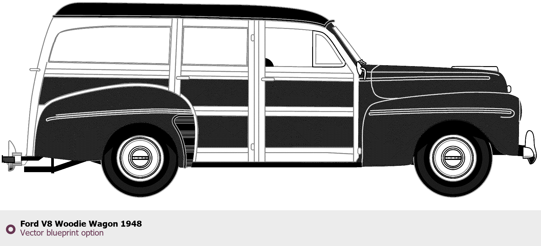 Raster blueprint of the 1948 Ford V8 Woodie Wagon Coupe. This free downloadable image can be used for graphic projects, digital design, and 3D modeling. The file provides accurate exterior proportions of the vehicle. Model year: 1948. Body type: Coupe.