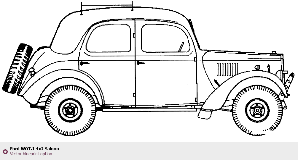 Raster blueprint of the Ford WOT.1 4x2 Saloon Sedan. This free downloadable image can be used for graphic projects, digital design, and 3D modeling. The file provides accurate exterior proportions of the vehicle. Body type: Sedan.