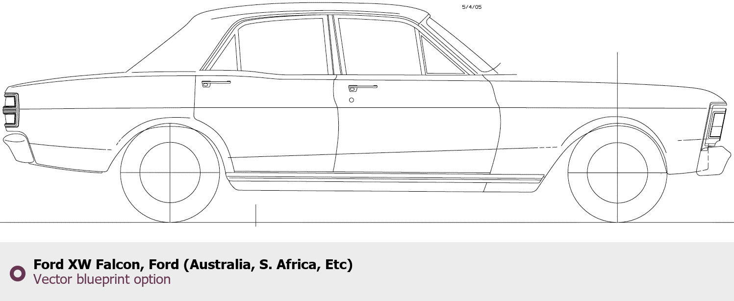 Raster blueprint of the Ford XW Falcon, Ford (Australia, S. Africa, Etc) Tag. This free downloadable image can be used for graphic projects, digital design, and 3D modeling. The file provides accurate exterior proportions of the vehicle. Body type: Tag.