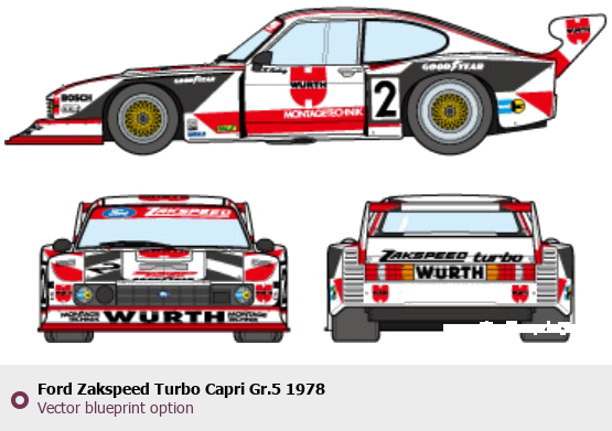 Raster blueprint of the 1978 Ford Zakspeed Turbo Capri Gr.5 Tag. This free downloadable image can be used for graphic projects, digital design, and 3D modeling. The file provides accurate exterior proportions of the vehicle. Model year: 1978. Body type: Tag.