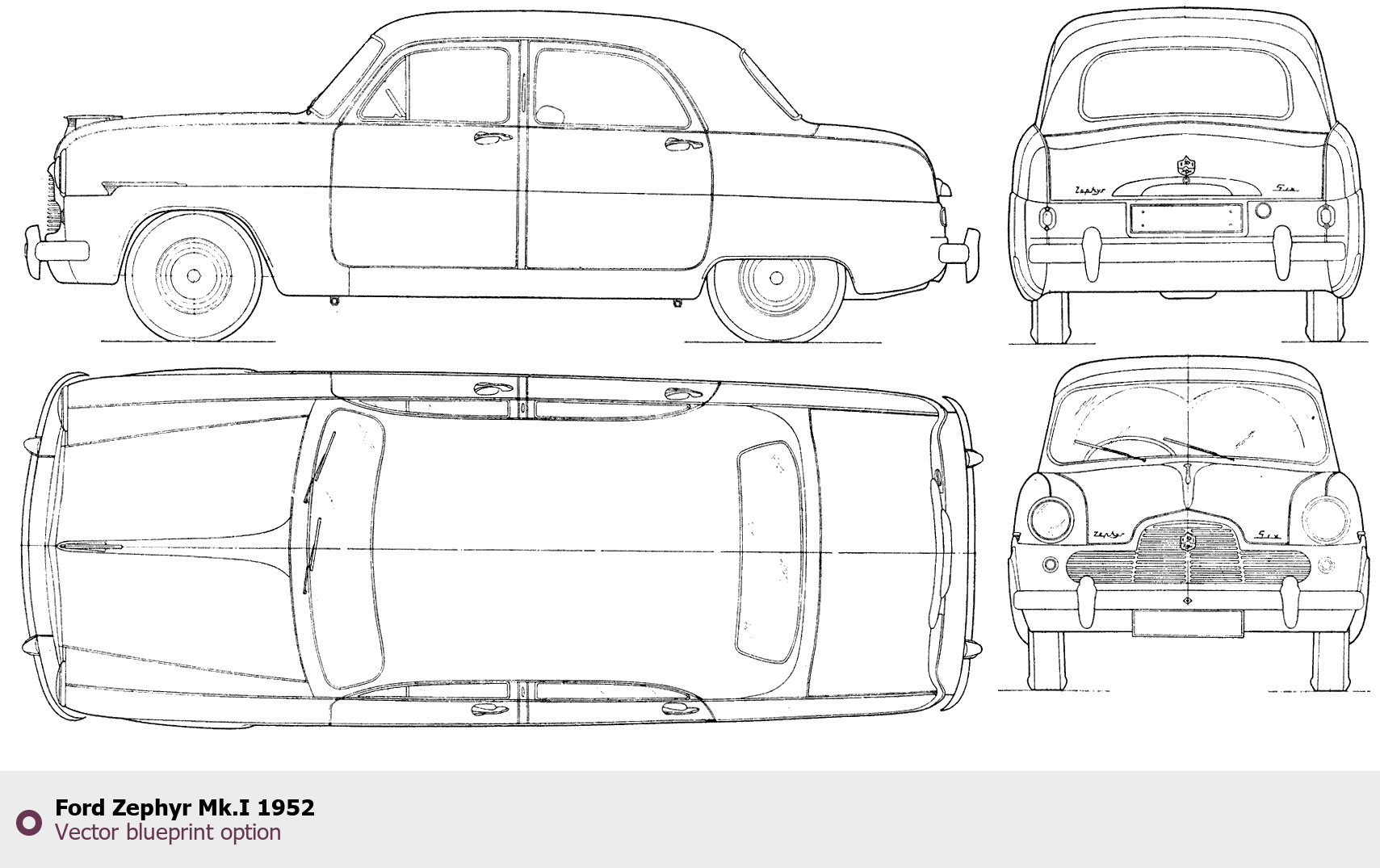 Raster blueprint of the 1952 Ford Zephyr Mk.I Tag. This free downloadable image can be used for graphic projects, digital design, and 3D modeling. The file provides accurate exterior proportions of the vehicle. Model year: 1952. Body type: Tag.