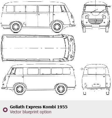 Raster blueprint of the 1955 Goliath Express Kombi Hatchback. This free downloadable image can be used for graphic projects, digital design, and 3D modeling. The file provides accurate exterior proportions of the vehicle. Model year: 1955. Body type: Hatchback.
