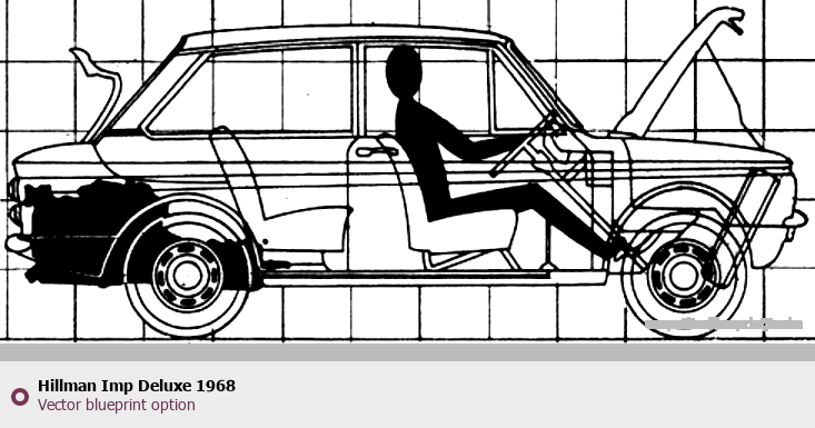 Raster blueprint of the 1968 Hillman Imp Deluxe Sedan. This free downloadable image can be used for graphic projects, digital design, and 3D modeling. The file provides accurate exterior proportions of the vehicle. Model year: 1968. Body type: Sedan.