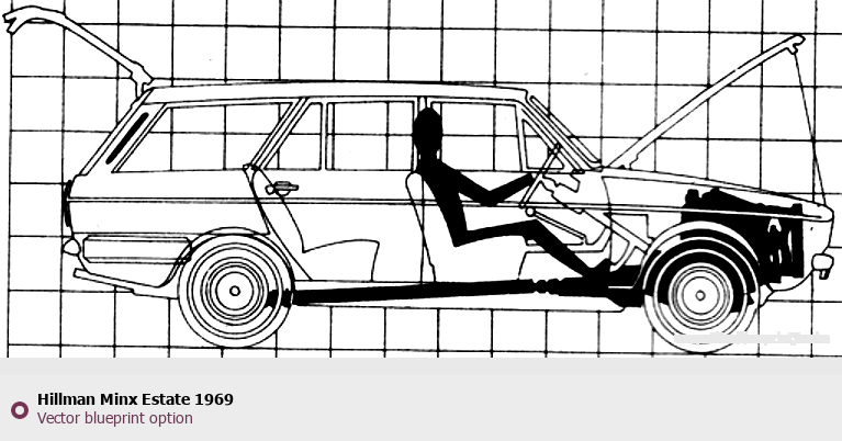 Raster blueprint of the 1969 Hillman Minx Estate Wagon. This free downloadable image can be used for graphic projects, digital design, and 3D modeling. The file provides accurate exterior proportions of the vehicle. Model year: 1969. Body type: Wagon.