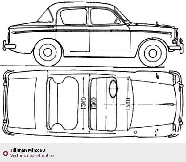 Raster blueprint of the Hillman Minx S3 Tag. This free downloadable image can be used for graphic projects, digital design, and 3D modeling. The file provides accurate exterior proportions of the vehicle. Body type: Tag.