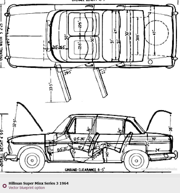 Raster blueprint of the 1964 Hillman Super Minx Series 3 Tag. This free downloadable image can be used for graphic projects, digital design, and 3D modeling. The file provides accurate exterior proportions of the vehicle. Model year: 1964. Body type: Tag.