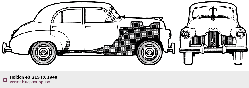 Raster blueprint of the 1948 Holden 48-215 FX Tag. This free downloadable image can be used for graphic projects, digital design, and 3D modeling. The file provides accurate exterior proportions of the vehicle. Model year: 1948. Body type: Tag.