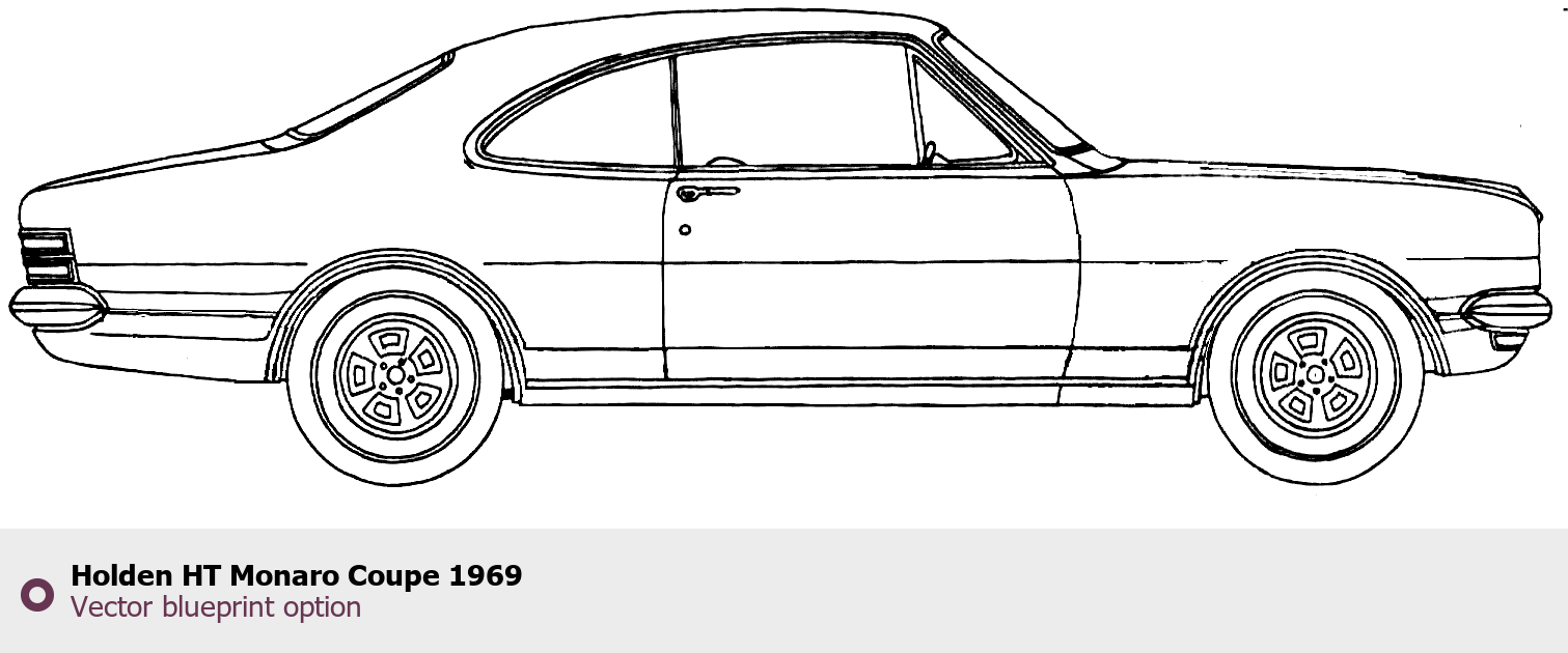 Raster blueprint of the 1969 Holden HT Monaro Coupe Coupe. This free downloadable image can be used for graphic projects, digital design, and 3D modeling. The file provides accurate exterior proportions of the vehicle. Model year: 1969. Body type: Coupe.