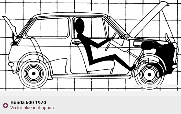 Raster blueprint of the 1970 Honda 600 Tag. This free downloadable image can be used for graphic projects, digital design, and 3D modeling. The file provides accurate exterior proportions of the vehicle. Model year: 1970. Body type: Tag.