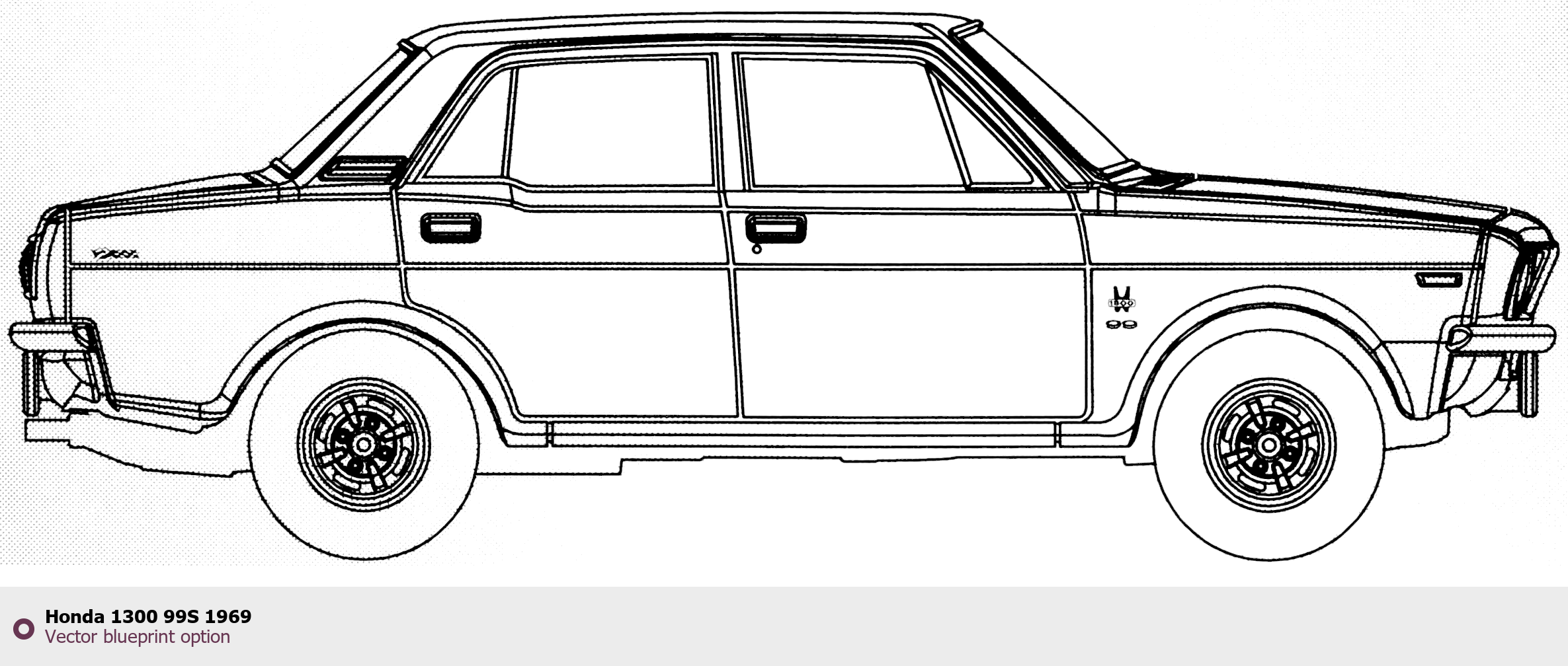 Raster blueprint of the 1969 Honda 1300 99S Tag. This free downloadable image can be used for graphic projects, digital design, and 3D modeling. The file provides accurate exterior proportions of the vehicle. Model year: 1969. Body type: Tag.