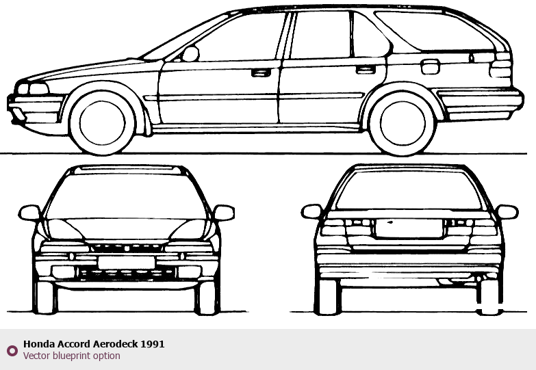 Raster blueprint of the 1991 Honda Accord Aerodeck Tag. This free downloadable image can be used for graphic projects, digital design, and 3D modeling. The file provides accurate exterior proportions of the vehicle. Model year: 1991. Body type: Tag.
