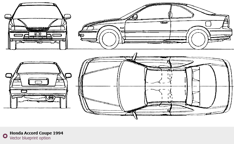 Raster blueprint of the 1994 Honda Accord Coupe Coupe. This free downloadable image can be used for graphic projects, digital design, and 3D modeling. The file provides accurate exterior proportions of the vehicle. Model year: 1994. Body type: Coupe.