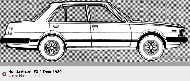 Raster blueprint of the 1980 Honda Accord EX 4-Door Tag. This free downloadable image can be used for graphic projects, digital design, and 3D modeling. The file provides accurate exterior proportions of the vehicle. Model year: 1980. Body type: Tag.